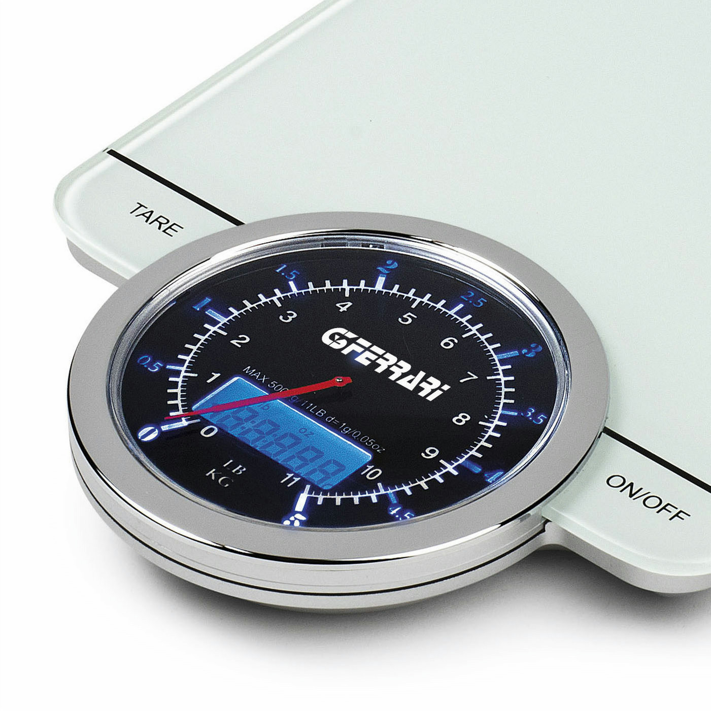 The electronic scale with high precision Formula Kitchen is made with a 20 mm-thick glass plate; with 5 kg capacity and 1 gram division, it ensures the maximum accuracy of measurement. This digital scale features various functions, such as auto-off for energy saving, tare option and double units measuring (grams and pounds). The weight reading is simple and immediate thanks to the dual display that echoes the look of the odometer of sports and formula 1 racing cars: analogical display with large double scale dial and digital blue-colour backlit LCD display.