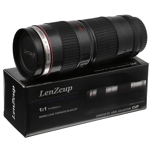 Display your love of photography while enjoying your favorite beverage! This lens cup is a replica model of a black Canon EF 70-200mm f/4L USM lens. The lens cup is made of food grade PVC plastic materials and a stainless steel thermos interior, making it safe to use for drinking. Not only can this lens cup be used for drinking, it can be used as a money box, pen holder, and much more! This mug is one of the most unique gift items that can be found for a photographer!
