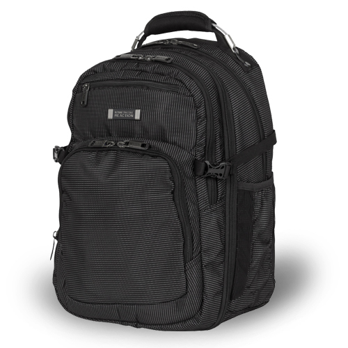 From the Kenneth Cole Reaction R-Tech collection, the "On the Fast Pack" expandable computer Backpack is designed for the comfortable handling of your laptop and tablet with identity protection for daily commutes or journeys. Its double gusset design includes an RFID blocking pocket for on-the-go identity protection. Backpack main compartment features a padded laptop pocket to accommodate up to a 15.6" notebook size, while the front comparment has a brushed polyester lined tablet pocket and RFID blocking technology. The front face features a zippered stash pocket lined with protective brushed polyeseter and a small gusseted pocket with an organizer. Each side features convenient open top, mesh beverage/accessory holsters and compression straps. The rear exterior features an ultra padded air mesh back with air flow channels to help keep you cool. The On the Fast Pack backpack may be comfortably worn with the padded, ergonomic shoulder straps and supportive sternum straps or hand carried with the heavy duty rubber grip top handle reinforced with steel cable. Backpack also includes a luggage strap that fits over most upright handles for hands-free carrying with trolley bags. Made with a two-tone black nylon exterior body material with fully lined interior. Backpack Dimensions: 18.0" H x 13.0" W x 7.0" D. Laptop Compartment Dimensions: 15.25" W x 10.5" H x 1.5" D. Weight: 2.4 lbs.