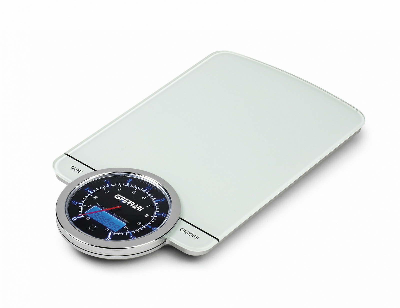 The electronic scale with high precision Formula Kitchen is made with a 20 mm-thick glass plate; with 5 kg capacity and 1 gram division, it ensures the maximum accuracy of measurement. This digital scale features various functions, such as auto-off for energy saving, tare option and double units measuring (grams and pounds). The weight reading is simple and immediate thanks to the dual display that echoes the look of the odometer of sports and formula 1 racing cars: analogical display with large double scale dial and digital blue-colour backlit LCD display.