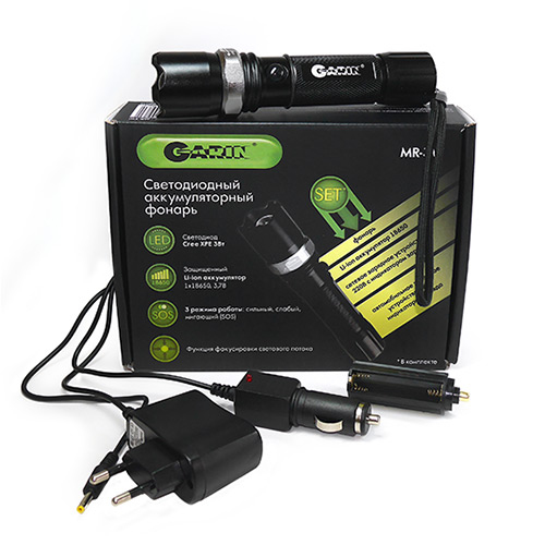 GARIN MR-3W, LUX. Flashlight type: Hand flashlight, Colour of product: Black, Stainless steel, Housing material: Aluminium. Lamp type: LED, Flashlight modes: High, Low, SOS mode, LED type: Cree XPE. Battery technology: Lithium-Ion (Li-Ion), Charging source: AC, Cigar lighter. Package type: Box. Battery adapter type: 18650/3x AAA