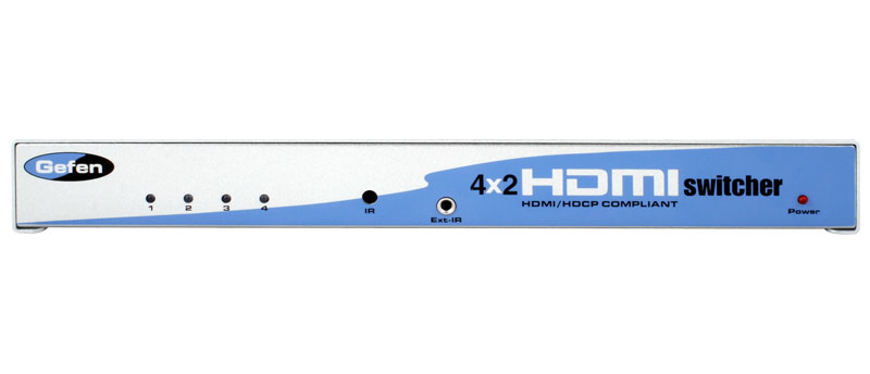 Gefen's 4x2 HDMI Switcher routes high definition video in multiple resolutions of up to 1080p plus multichannel digital audio from any of four sources. The inputs accommodate the simultaneous connection of up to four high definition video sources, such as satellite systems and HD DVD players. Two outputs send the high definition audio/video signals to up to two high definition displays. A digital audio output port is available if you need to direct the audio to an audio receiver. Switching is done via the IR remote that is provided with the unit.