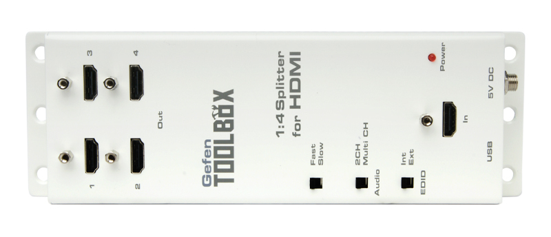 The GefenToolBox 1:4 Splitter for HDMI with FST and 3DTV sends a Hi-Def A/V source to up to 4 HDTV displays at the same time without losing quality or resolution. This product works with any Hi-Def source supporting resolutions up to 1080p Full HD with Deep Color, 3DTV pass-through, and lossless audio formats such as Dolby TrueHD and DTS-HD Master Audio.