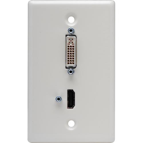 HDMI/DVI Combo Wall Plate The HDMI™ /DVI Wallplate allows you to terminateHDMI™I and DVI connectors at the wall for in-wall installations. The HDMI/DVI Wallplate is made to fit into a standard U.S. wall mount hole, similar to an AC outlet or light switch. Their practical design makes these wall plates an ideal solution for DVI and HDMI cable extensions for home or business location. HDMI and DVI connector included.