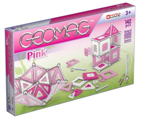 Geomag Pink 142 includes 36 silver magnetic rods, 28 non-magnetic steel spheres, 76 assorted pink, magenta, and white panels and 2 graphic panel inserts.