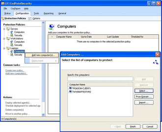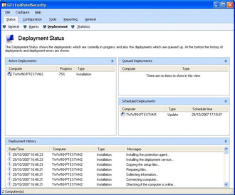 Scheduled deployment: When the user effects any policy or configuration changes through the console, it is now possible to close the GFI EndPointSecurity console and allow the agent deployment to take place automatically on a schedule. The deployment is handled by the GFI EndPointSecurity service which will also handle failed deployments through rescheduling.