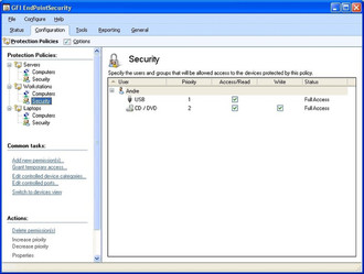 GFI EndPointSecurity gives you the tools you need to actively manage the use of all types of connectable devices through USB/FireWire such as wireless cards, cameras, iPods, PDAs, and many more. We give you full network-wide control through unique group-based protection as well as advanced granular access control, white lists and blacklists.