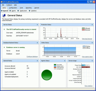 Status dashboard: A revamped user interface now includes a status dashboard which shows the agents live status, agent deployment status, Database status, GFI EndPointSecurity service status and statistical data with charts.
