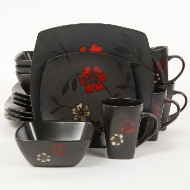Evening Blossom 16 Piece Dinnerware Set, Black Your evening dinner and Evening Blossom dinnerware from Gibson Elite are a graceful match. Dinnerware: finished with a floral silk screen decal soft square silhouette style for those who appreciate fashion statements for the table