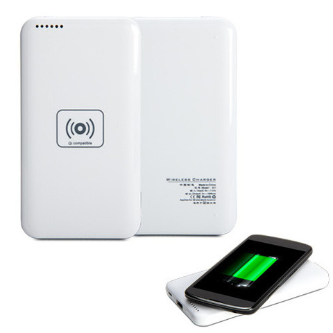 - Portable Qi wireless charger with 1000 mA (1A) output and 5000 mAh backup battery power bank