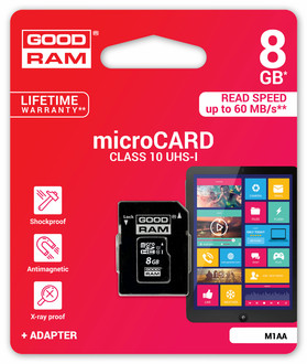 GOODRAM M1A0/M1AA micro memory cards with UHS-I interface will prove ideal in the latest generation of electronic devices. Super fast interface – UHS-I – will allow you to make full use of the advantages of modern photo and video cameras and attached SD adapter will let you use the microCARD also in other devices with a slot for SD cards. The product is also available in packaging without th adapter.