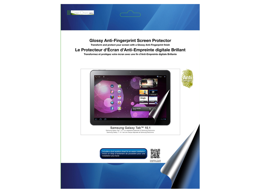 This is a Glossy Anti-Fingerprint Screen Protector for Samsung Galaxy Tab 10.1. This special coating is the latest in Screen Protector types from Green Onions Supply: It maintains the bright and vibrant look of the Galaxy Tab screen while adding protection and fingerprint resistance. It covers the screen and surrounding bezel, and measures 251.48 x 170.28 mm or 9.9 by 6.7 inches.