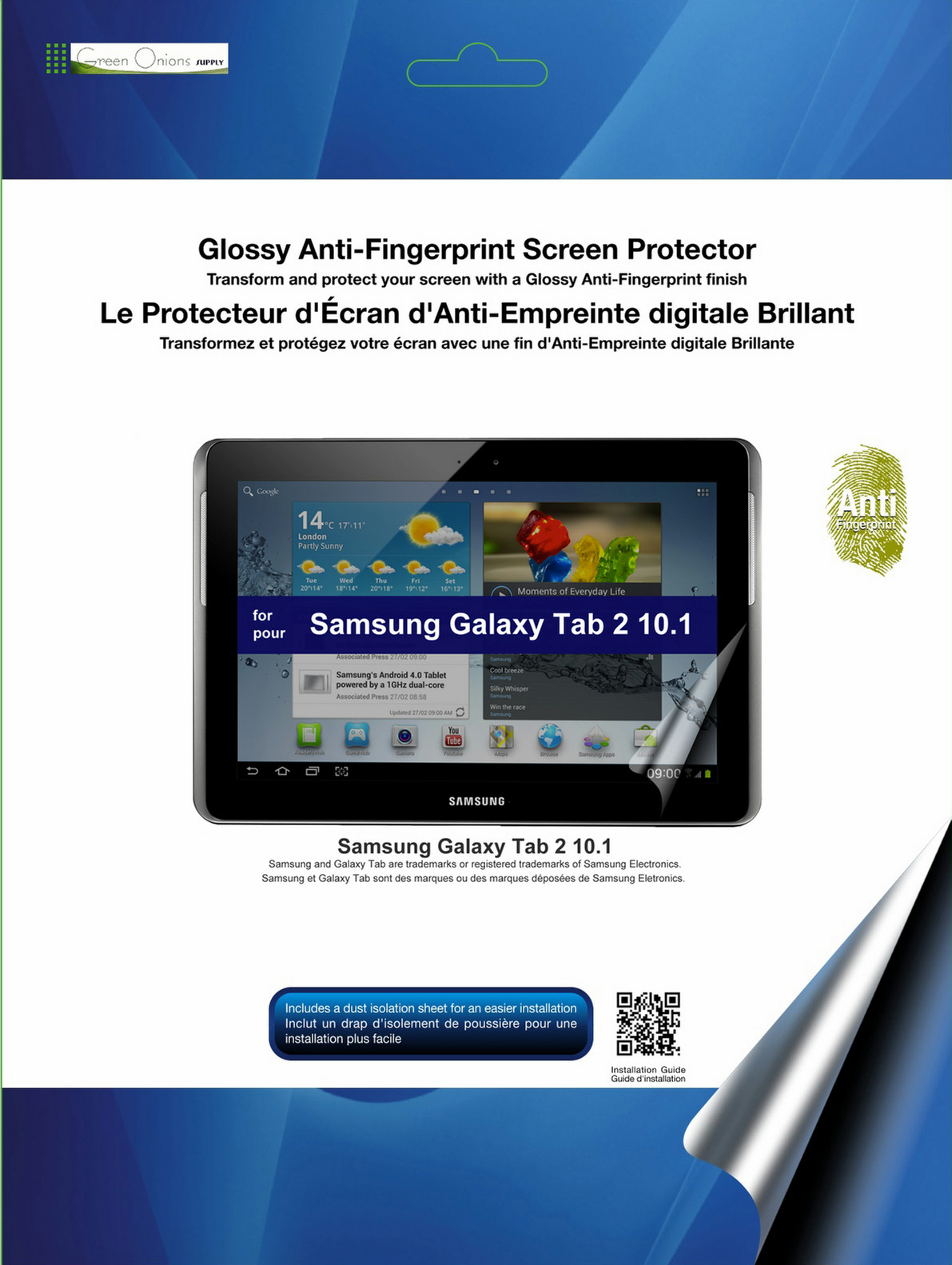 This is a Glossy Anti-Fingerprint Screen Protector for Samsung Galaxy Tab 2 10.1. This special coating is the latest in Screen Protector types from Green Onions Supply: It maintains the bright and vibrant look of the Galaxy Tab 2 screen while adding protection and fingerprint resistance. It covers the screen and surrounding bezel.