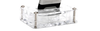 AirCurve looks like a simple, elegantly minimal stand for your iPhone. But inside is a coiled waveguide "horn' that collects the sound from the built-in speaker of your iPhone, amplifies it (by about 10 decibels), and projects it into the room. AirCurve's waveguide has been mathematically engineered to deliver amazing amplification -- you'll swear there are full-sized speakers in there. And AirCurve's see-through translucent polycarbonate body lets you appreciate the graceful curves inside that do all the work.