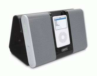 High-efficiency internal Lithium-Ion batteries recharge with the included AC adapter or through your computer powered USB port (we call it Dual Fuel technology). Your iPod sits center stage on the adjustable Dock connector. You control the iPod with the included remote. SRS Labs SRS WOW digital signal processing pumps shimmering highs and deep, rich bass response through Journi two-way speaker system.