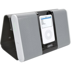 High-efficiency internal Lithium-Ion batteries recharge with the included AC adapter or through your computer's powered USB port (we call it Dual Fuel technology). Your iPod sits center stage on the adjustable Dock connector. You control the iPod with the included remote. SRS Labs' SRS WOW® digital signal processing pumps shimmering highs and deep, rich bass response through Journi's two-way speaker system.