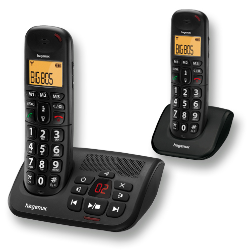 Hagenuk BIG 805-2. Type: DECT telephone, Recording time: 15 min, Ringer type: Polyphonic. Colour of product: Black. Volume control: Digital, Personalization: Menu. Phonebook capacity: 20 entries. Display: LCD, Backlight colour: Orange