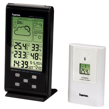 - Two-part set comprising a base station and a wireless outdoor sensor (range: up to 80 m; 433 MHz), for digital meteorological observation and to display the time (DCF radio clock), weekday and date
