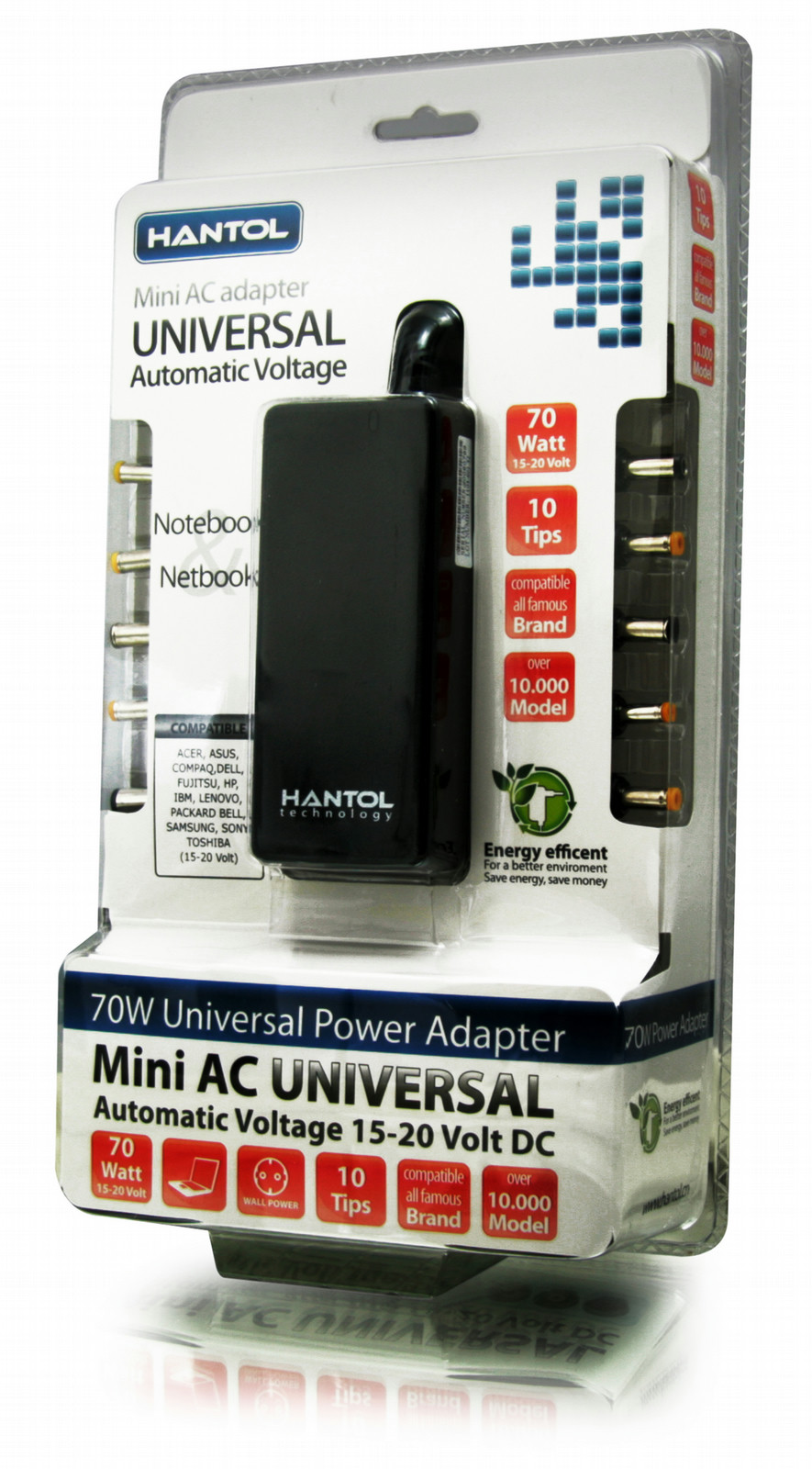 Hantol NBP70-EU. Output power: 70 W, Output voltage: 20 V. Power supply type: Indoor, Purpose: Notebook. Colour of product: Black