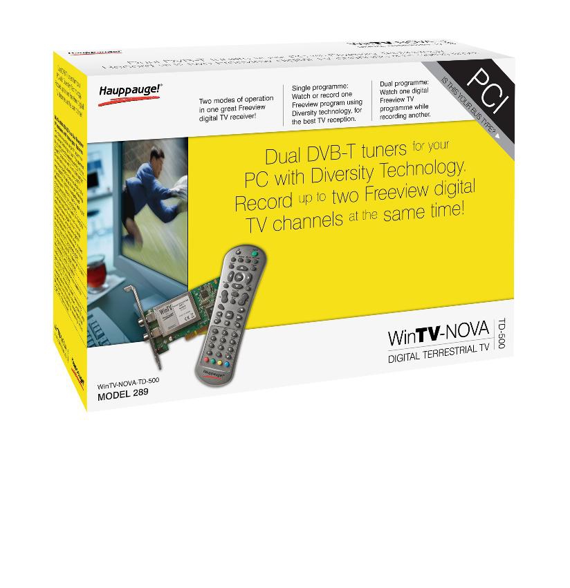 Hauppauge WinTV-NOVA-TD-500-HD. TV tuner type: DVB-T. Interface type: PCI. Minimum processor: 1,7 GHz. Minimum system requirements: PCI slot CD-ROM, Compatible operating systems: Windows Vista, XP