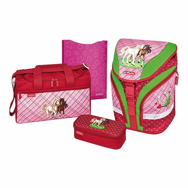 Plus: All designs include a sports bag, a pencil box with 17 items and a detachable inside compartment, a workbook case in pink for girls and in blue for boys.