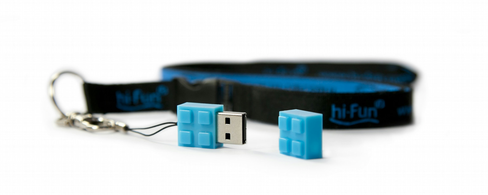 hi-Memory is a small USB flash drive with a trendy and original design. In fact hi-Memory looks like a small brick that carries inside a 4 Gb flash drive. The hi-Memory comes with a lynard and can be attached to your key chain so you can always carry it around and use it whenever you want to download music and movies.