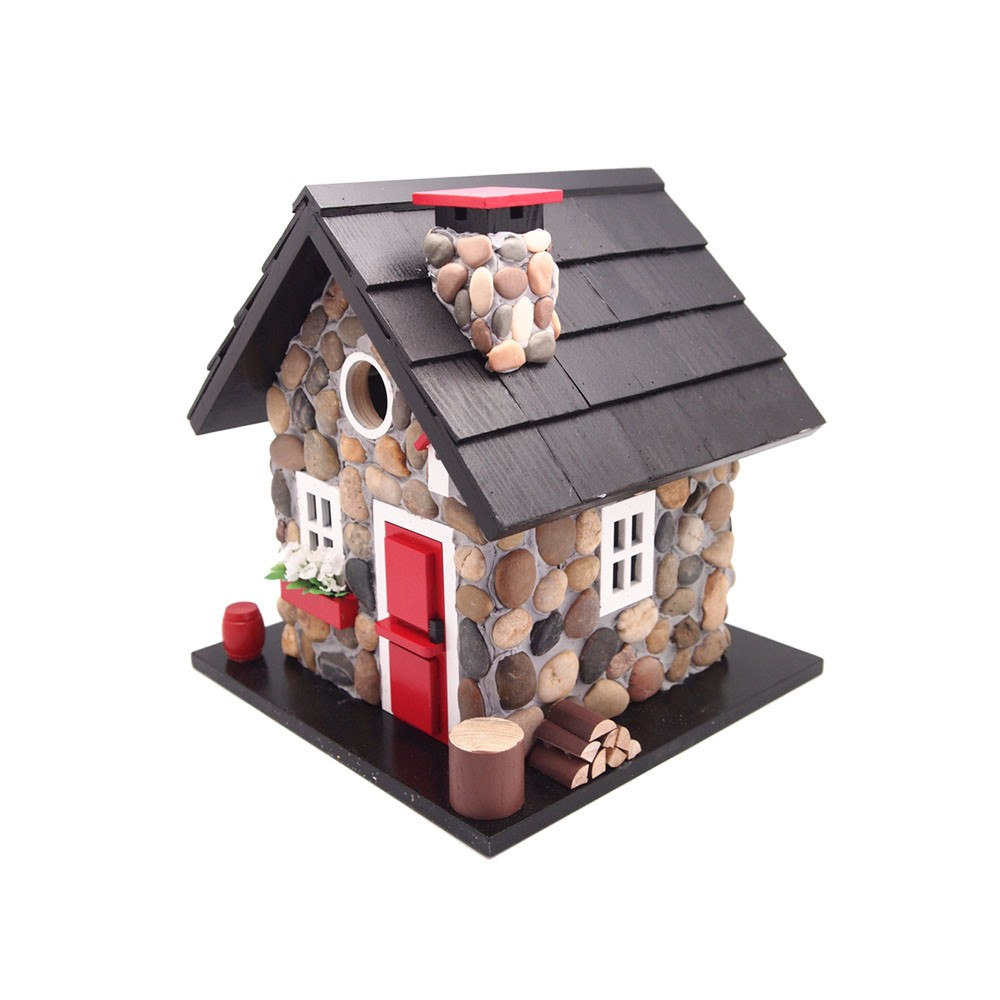 This style has a genuine black pine shingled roof a removable back wall for easy cleaning a 1 1/4 entry hole to an unpainted nest box ventilation and drainage holes.