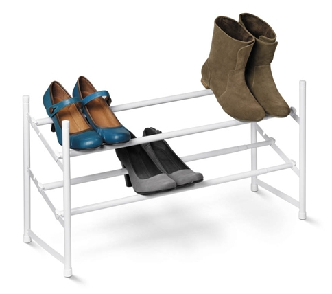 Honey-Can-Do SHO-01167 2-Tier Expandable Stackable Shoe Rack, White. Customize your shoe storage with this versatile 2-tier shoe rack. Perfect for families and couples, this rack neatly displays shoes of nearly any size. Simply lock the bars into either of two positions for large or small sizes. As your shoe collection grows, the rack expands from 24 inches to 44 inches wide. Plus, the stackable design means you can add multiple racks for even more storage. Constructed of white, powder-coated steel, the frame is rust-resistant and coordinates nicely with any decor. Some assembly required.