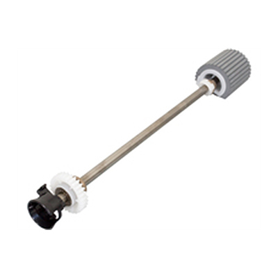 Pickup roller assembly - Includes a steel shaft with a rubber 'D' shaped roller, drive gear, bushings, sensor flag, and two retaining clips - Mounts in the bottom of the ADF paper pickup assembly