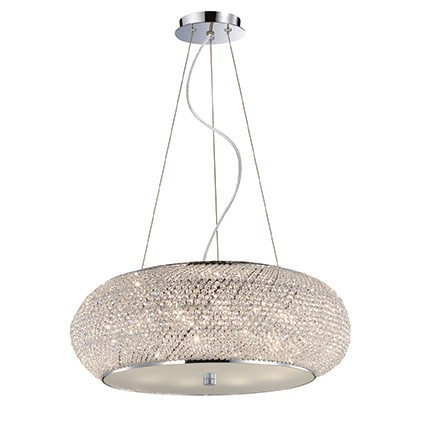 Metal frame. Diffuser consisting of lines of cut crystal pearls. Bottom part closed by a round, sandblasted glass. Steel cables adjustable in length with an automatic device.