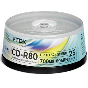 TDK Life on Record CD-RW rewritable recording media is designed for recording in computer drives. With 700MB capacity, each TDK CD-R can store up to 80 minutes of non-compressed, CD-quality music, hundreds of digital photos or large data files. These high performance discs can be played in most CD or DVD/CD players, computer drives, and game consoles. A single TDK CD-RW can be re-recorded with new data hundreds of times, making it ideal for any application where you may want to replace a disc's old data with updated content. Repeatedly use the same disc for regularly scheduled hard drive backups, to make fresh music and MP3 mixes for the road, and more.