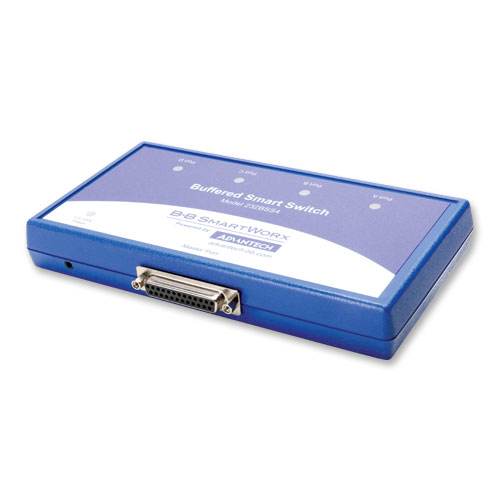 Our most intelligent and versatile switch, the 232BSS4 provides communication to four devices from one serial port. Each port contains a dedicated UART and an 8K byte transmit and receive buffer, allowing each ports data rate, data format, and protocol to be configured independently. The Master port can send and receive data from one Slave port while the other Slave ports continue to buffer data. The Master can also broadcast the same message to two or more Slave ports at once. The switch can also be configured to send data automatically to the Master port from each of the Slave ports when data is present with an optional preamble identifying the port. It can also provide two-way communications between the Master port and one Slave port at a time. Switching and control is accomplished through user defined three or four character command strings. These control sequences are stripped from the data stream, making the switch transparent to the Slave devices. Switches can be cascaded to expand the 232BSS4 to more than four ports. Two units can also be used back-to-back to provide automatic connection between devices over a single data channel. LEDs indicate when the unit is powered up and which port is selected to send data to the Master port. Setup software is provided on CD and is compatible with Windows 98, ME, 2000, XP, and Vista. A 12VDC power supply with a 2.5mm (positive tip) phone jack is required (sold separately).