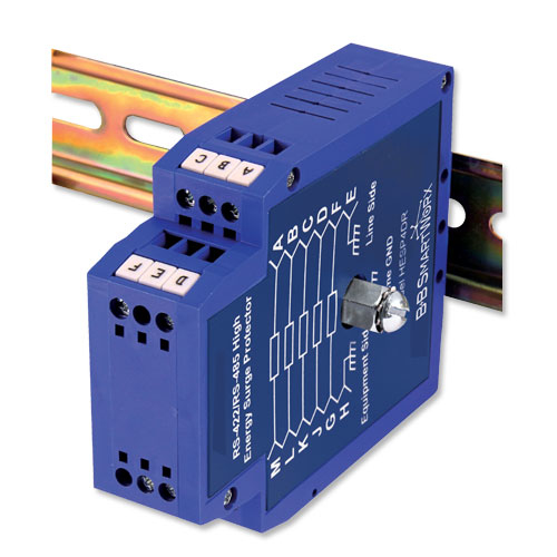 Model HESP4DR meets IEEE 1000-4-5: 1995 and IEEE C62.41-1991 recognized standards for premium surge protectors. It protects against lightning strikes, power surges, and other types of voltage disturbances with three stages of protection for each supported line: a gas discharge tube followed by a series resistor and finally a Transient Voltage Suppresser (TVS). Five RS-422/485 signals on terminal blocks are supported with a clamping voltage of 6.8 Volts. The HESP4DR is housed in a sturdy DIN rail mount case with a #10 grounding screw. In order to work properly, it is important to have a good connection between the #10 screw and a solid earth ground.