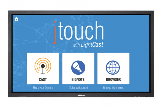 This 65-inch InFocus JTouch Whiteboard with LightCast and anti-glare is a turn key digital whiteboard solution with wireless device connectivity and web browser built-in.