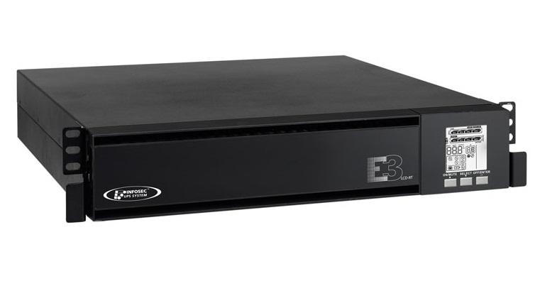 Infosec E3 LCD RT, 2000 VA. Output power capacity: 2000 VA, Output power: 1300 W, Power supply input frequency: 50/60. Colour of product: Black. Noise level: 45 dB. Certification: EN 62040-2, EN 62040-1-1.. Weight: 23 kg