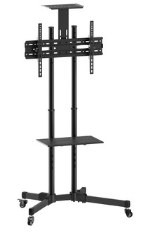 The economy multifunctional TV cart 05446 offers complete solution by serving a variety of projection needs for businesses, schools and other organizations. The versatile presentation carts allow you to hold meetings with A/V support or simply to display information. The steel poles are simple but strong. The included height-adjustable panel mount supports TVs of up to 70 inches. It also includes height adjustable DVD/AV shelf and camera shelf.