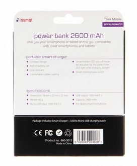 Insmat 860-3015. Charger type: Indoor, Outdoor, Charger compatibility: Universal, Power source type: Battery, USB. Colour of product: White. Output voltage: 5 V, Output current: 1 mA. Width: 78 mm, Depth: 22 mm, Height: 32 mm. Cables included: USB