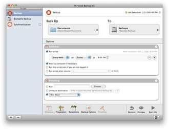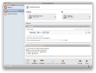 All of Personal Backup X's scripts offer a wide range of customization options. You can set schedules, so your scripts run automatically, you can choose exceptions, to copy or not copy specific types of files, and you can have Personal Backup X5 run any program before or after it executes a script.