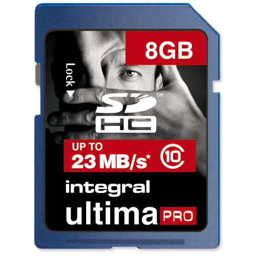 Integral's UltimaPro SDHC Class 10 memory cards are ideal for use in DSLR cameras and Full HD camcorders. UltimaPro SDHC with Class 10 specification perform at up to 23MB/s transfer speed* and are designed to be used where fast memory cards are crucial; to capture high resolution images and to shoot Full HD video.