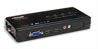 The INTELLINET NETWORK SOLUTIONS KVM Switch Model 157032 is a 4-port compact KVM Switch with Audio and Mic switching functionality. Its USB support on the console side allows you to use a USB keyboard and mouse. It comes with 4 sets of detachable USB KVM combo cables & 4 sets of Audio/Mic cables for SOHO and office desktop multimedia applications. And it allows you to access, control, boot, and reboot four USB-enabled multimedia computers with only one USB keyboard, mouse, monitor and optional speaker set and microphone, using the Switching Software Client installed on your PCs.