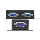 Through this VGA Extender, you can use one PC to display identical image and extension of VGA signal up to 180 meter on monitors. Equalization length is adjustable. VGA signal gain is adjustable. On the transmitter side there is an extra VGA connection which enables you to see what is being transmitted at the receiver side on your local screen.
