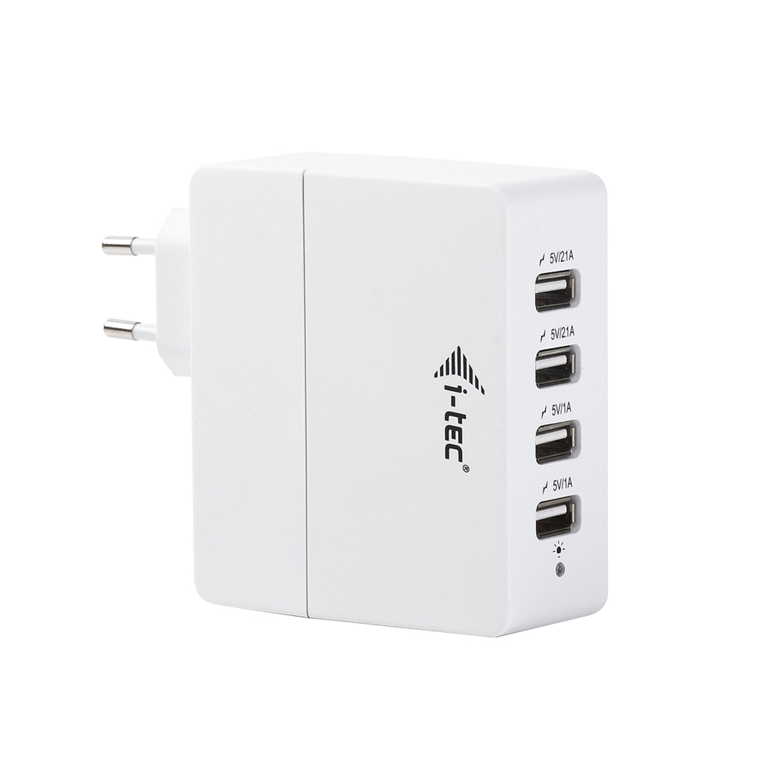 i-tec USB Quatro Charger 4 Port is a network-based USB charger for mobile phones, tablets, GPS navigations, powerbanks, music players, cameras and other types of digital equipment. You can charge up to 4 pieces of USB equipment simultaneously. Two USB ports DC 5 V / max. 2,1 A are designed for fast and efficient charging of mobile equipment requiring high charging current. Further, they include special identification circuits for the iPad/iPhone and Samsung phones and tablets. The AC 100-240 V input enables global use. Safety is ensured by over-current protection and by constant charging current. This USB charger can be used in homes, in business centers and also in offices.