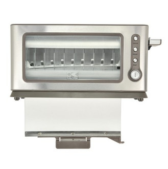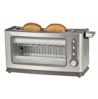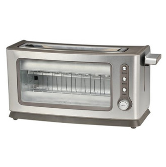 Wake your morning up with this chic Kalorik transparent glass side toaster! This toaster lets you see those slices gradually turning just the right shade of golden brown that meets your preference. Not only is this appliance easy to use with its cancel, bagel, reheat, and defrost function, but clean up is hassle free with a slide out glass frame and a removable crumb tray. Another great highlight is the toasters extra-lift, auto-shut-off, and auto-centering guide. Be the first of your friends and family to own such a unique appliance like this!