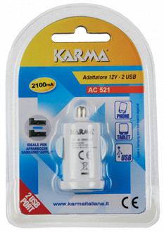 Karma AC 521. Charger type: Auto, Charger compatibility: Smartphone, Power source type: Cigar lighter. Colour of product: Ivory, LED indicators: Power. Output voltage: 5 V, Output current: 2100 mA. Width: 47 mm, Depth: 20 mm, Height: 20 mm
