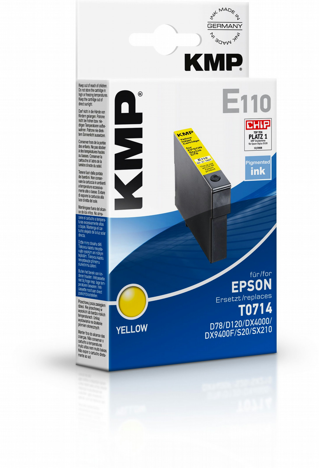 KMP E110. Printing colours: Yellow, Compatible products: Epson Stylus D 120, D 92, DX 4000, DX 4050, DX 4400, DX 4450, DX 5000, DX 5050, DX 5500, DX 6000, DX, Page yield footnote: ISO/IEC 24711