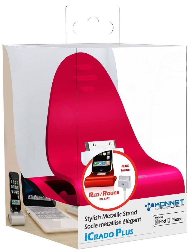 The iPhone is a thing of beauty. With this in mind, we designed iCrado to extend the elegance of iPhone while docking. A contemporary design and smart yet simple features allow you to charge, sync and dock with minimal effort. An extra wide opening provides easy access to charging the iPhone with or without a protective case. A dedicated port fits Apple's 30 pin USB cable so charging and syncing is a breeze. iCrado's advanced sound reflection enhances iPhone audio quality and mic reception for crystal clear hands-free listening. Available in a variety of beautiful and bold brushed metallic colors. A KONNET Signature Design.