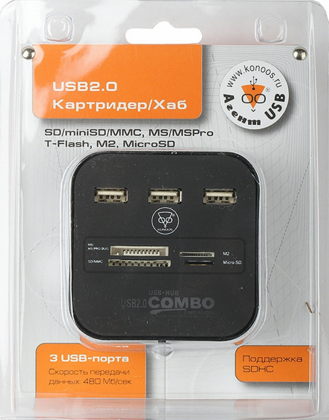 Konoos UK-29. Hub interfaces: USB 2.0. Data transfer rate: 480 Mbit/s, Compatible memory cards: Memory Stick (MS), MicroSD (TransFlash), MiniSD, MMC, SD