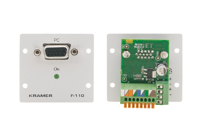 The F−110 is a wall plate insert transmitter for computer graphics video signals with resolutions up to and exceeding UXGA. It converts a computer graphics video signal into a twisted pair signal that it transmits to a TP−120 twisted pair receiver (or other compatible Kramer receiver).