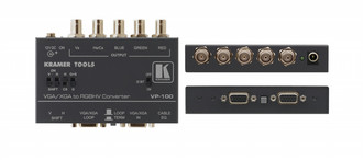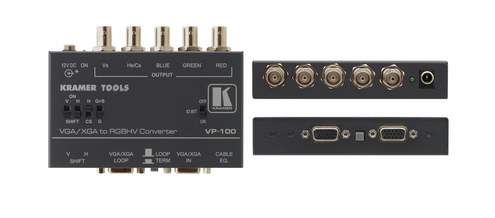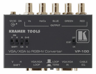 The VP−100 is a high−performance format converter for computer graphics video signals. It converts a computer graphics video signal on a 15−pin HD connector to either RGBS, RGsB, or RGBHV video signals on BNC connectors.