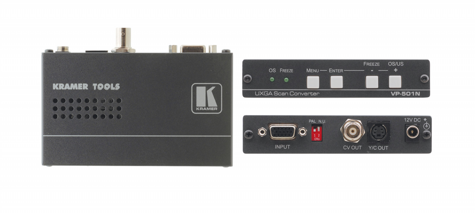 The VP−501N is a scan converter for computer graphics and HDTV component video signals. It converts the input up to UXGA (1600x1200) and HDTV (1080i)to composite and s−Video (Y/C) signals simultaneously in either PAL or NTSC formats.